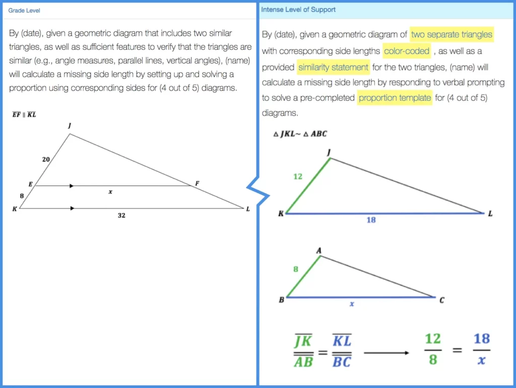 The Grade Level (left) example diagram displays all of the pertinent information that a student needs in order to solve a proportion, i.e. side lengths, labeled vertices, variable for the missing side length, and a clear image of the triangles. This contrasts from the Intense Level of Support (right) example diagram which includes color-coded side lengths on two separate triangles with colors that correspond to the side lengths in the proportionality. What remains constant is that both examples require students to solve for x independently, which is the skill needed to meet the standard.