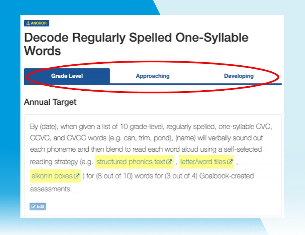 We take teacher feedback seriously and use it as one of the key drivers for improving our instructional design tools. For that reason, we’ve made some major commitments around Goalbook Toolkit Anchor Pages. First, All of the goals that we produce moving forward will be Anchor Page and second, these pages will be enhanced to aid in the process of creating solid IEPs.