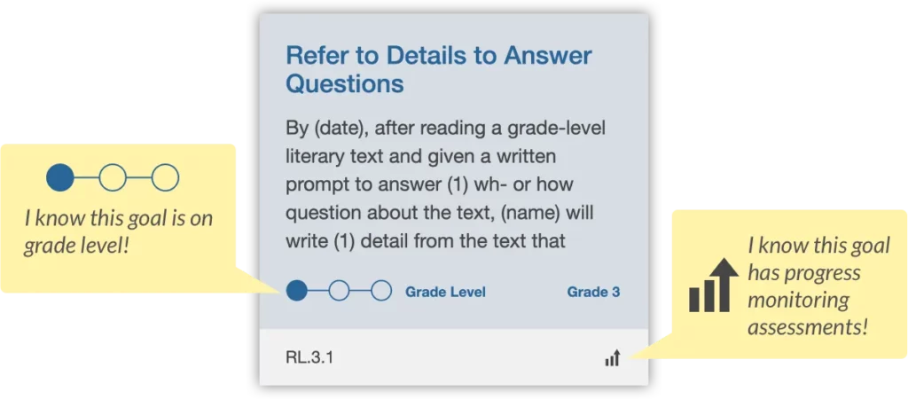 The newly added icons on Goal Tiles show you key information about the goals you may want to use. The three-point icon tells you the accessibility level of the goal: On Grade Level, Developing, or Approaching. The steps and arrow icon tells you the goal has printable progress monitoring assessments. The addition of these changes lets you skim the browse page and pinpoint exactly what you need before opening the goal.