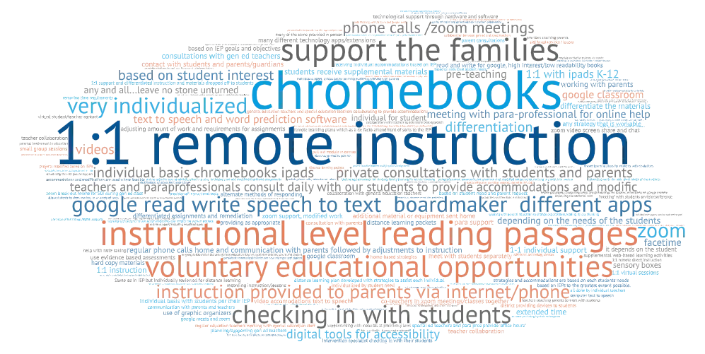 Overwhelmingly, the accommodations and modifications to make remote learning more accessible for students with special needs were driven based on the needs of each student and their IEP goals. These often included 1:1 support from teachers and/or other staff, along with a variety of technology tools that may or may not have previously existed within schools/districts.