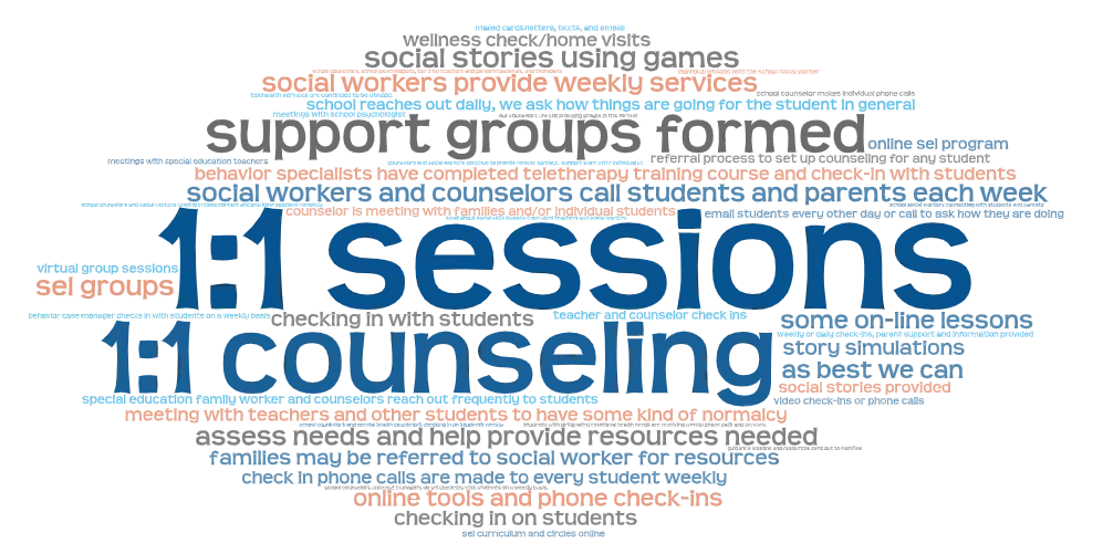 While 1:1 sessions were common in meeting SEL needs of students, families, and staff, this strategy was combined with others such as online SEL curriculum, social stories using games, and small support groups. As the 2020–21 academic year approaches, respondents recognized that assessing and addressing SEL needs will be a top priority.