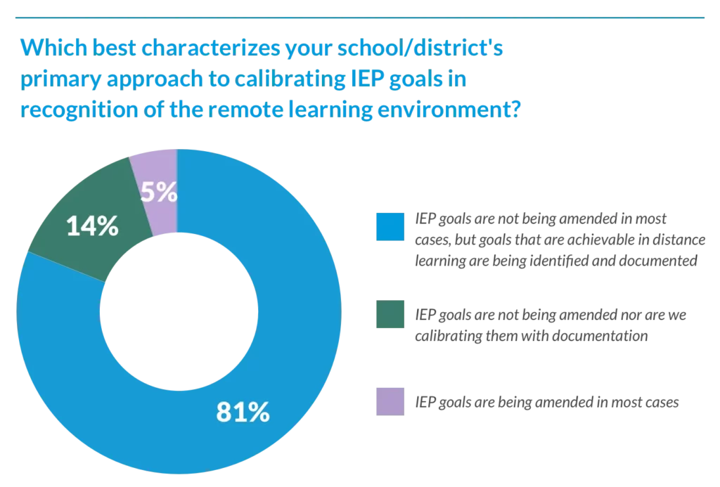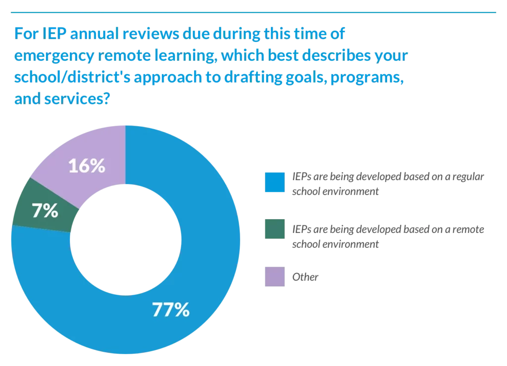 77% of special education leaders shared that IEPs are being developed based on a regular school environment for 2020–21 despite the uncertainty of what the 2020–21school year will look like and how it may evolve.