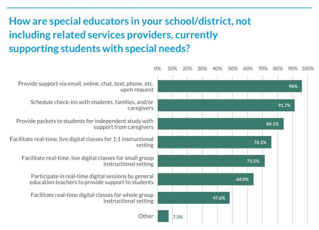 Special education leaders cited examples of “other” supports special educators are providing to support students with special needs such as creating videos for students and families, visits with students at home or at school with social distancing, and implementing project-based learning activities, and adapting general education curriculum materials.