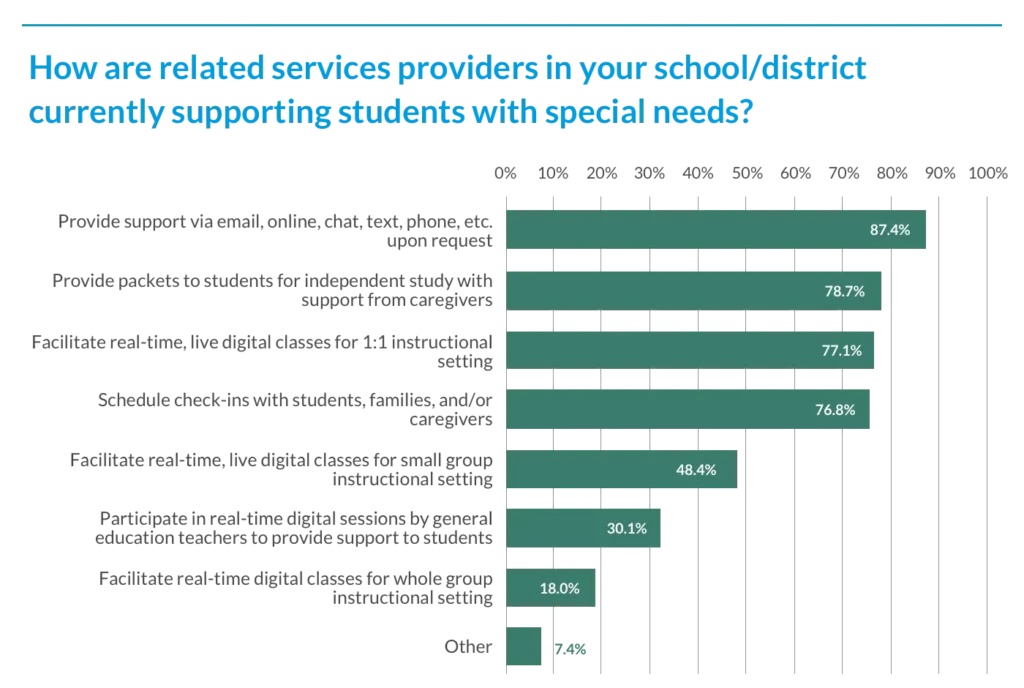 Similar to special educators, related services providers may also be providing “other” supports such as recording videos for students and families, facilitating teletherapy, or visiting with students at home or at school.