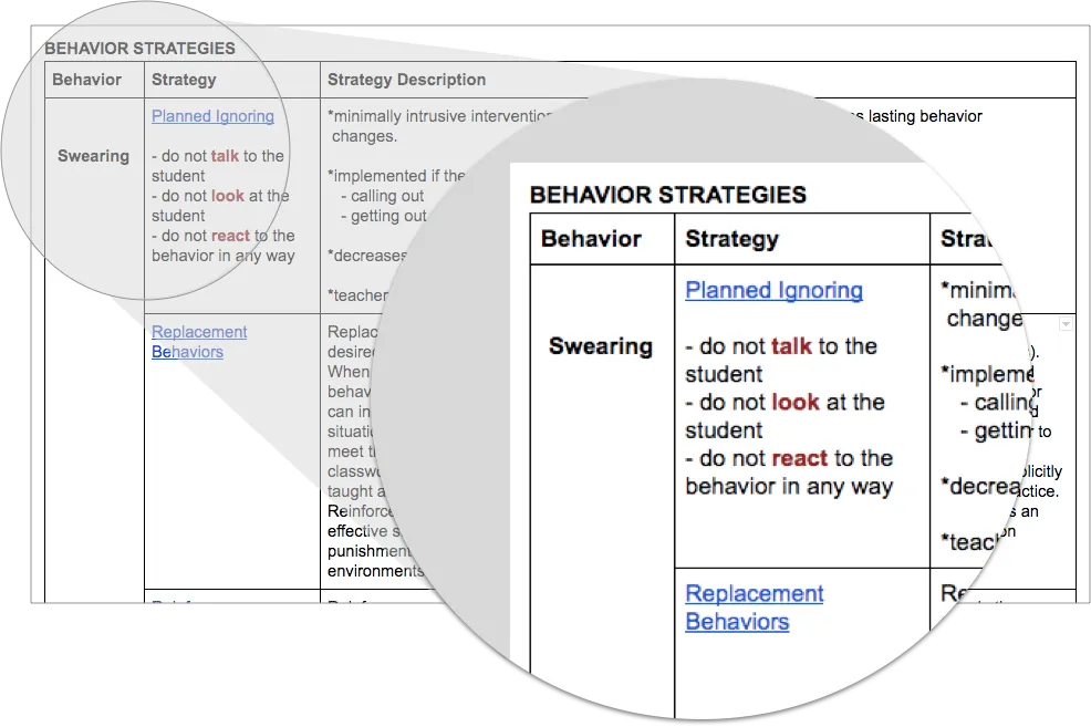 Behavior Strategies Quick Reference Guide Prototype: the leadership team took feedback from user interviews and made the reference guide easier to read by adding bullet points outlining the most important information. They also linked the strategies to pages within Goalbook Toolkit: Planned Ignoring for extended learning.